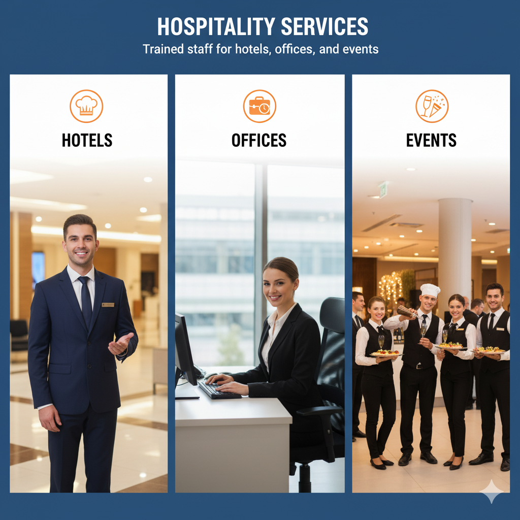 We supply trained and reliable hospitality staff for restaurants, hotels, coffee shops, and events.
